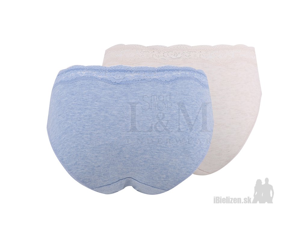 Dámske vzorované nohavičky KEY LPR299 bikinového strihu sú vyrobené z jemného bavlneného úpletu typu Cotton-Soft s obsahom bavlny až 95% a podielom elastanu. Majú hladký povrch, légy sú lemované tenkou elastickou lemovkou. Pás je z jemnej elastickej čipky vo farbe nohavičiek, vpredu v strede je malá mašlička. Nohavičky KEY LPR299 majú na ľavom boku všitý štítok s nápisom Key. V dvoj-balení sú dva kusy hladkých nohavičiek s krajkou kombinované v dvoch atraktívnych farebných prevedeniach, svetlomodrá melanžovaná a telová melanžovaná.