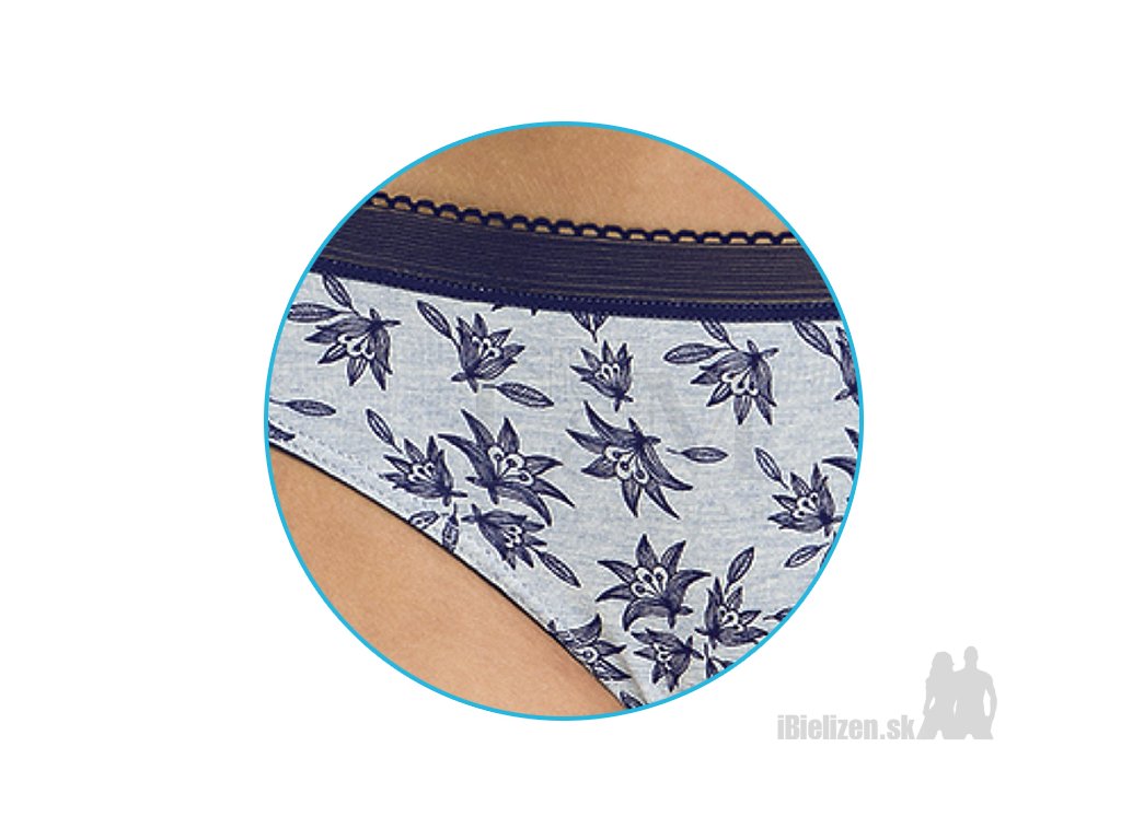 Dámske vzorované nohavičky KEY LPR523 bikinového strihu sú vyrobené z jemného bavlneného úpletu typu Cotton-Soft s obsahom bavlny až 95% a podielom elastanu. Majú hladký povrch, légy sú lemované tenkou elastickou lemovkou. V páse je pohodlná guma ukončená tenkou čipkovanou lemovkou, vpredu vľavo je malá mašlička. Nohavičky KEY LPR523 majú na ľavom boku všitý štítok s nápisom Key. V dvoj-balení sú dva kusy hladkých vzorovaných nohavičiek s kvetinovým motívom kombinované v dvoch atraktívnych farebných prevedeniach, tmavomodrá a svetlomodrá.