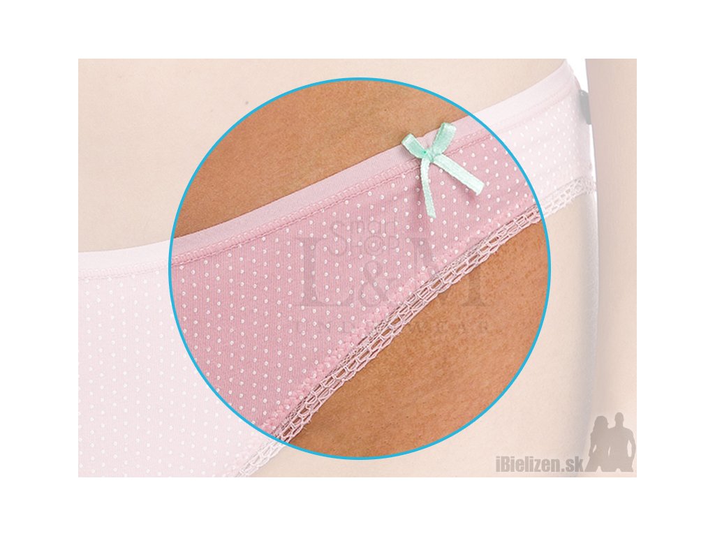 Dámske klasické bavlnené nohavičky KEY LPR601 A21 s nižším pásom z kolekcie Color od KEY, sú zhotovené z jemného bavlneného úpletu s obsahom bavlny až 95% a podielom elastanu. Vzorované nohavičky majú v páse po obvode jednoduché lemovanie, légy sú tenko lemované čipkou, vpredu vľavo je malá dekoratívna mašlička. Nohavičky majú hladký vzorovaný povrch. V dvoj-balení sú dva kusy klasických nohavičiek KEY LPR601 A21, jedny ružové s malými bodkami, druhé v zelenom prevedení s kvetinovým vzorovaním. Krásne a pohodlné nohavičky na každodenné nosenie.