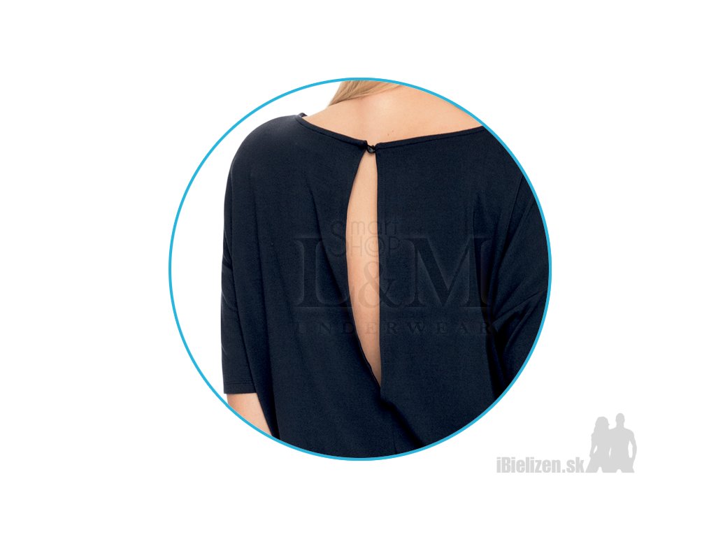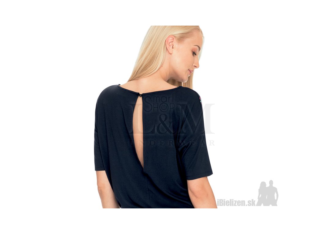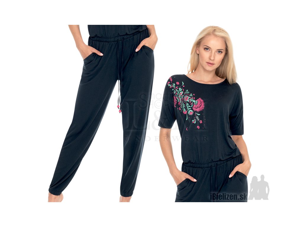 Dámske jednodielne pyžamo / domáci overal KEY LHJ546. Horná časť, tričko s veľkým dekoratívnym motívom, má krátke rukávy a lodičkový výstrih. Zmyselný prestrih na chrbte má za krkom zapínanie na jeden gombík. Dolnú časť dámskeho overalu tvoria ležérne dlhé nohavice so sťahujúcou šnúrou v páse.