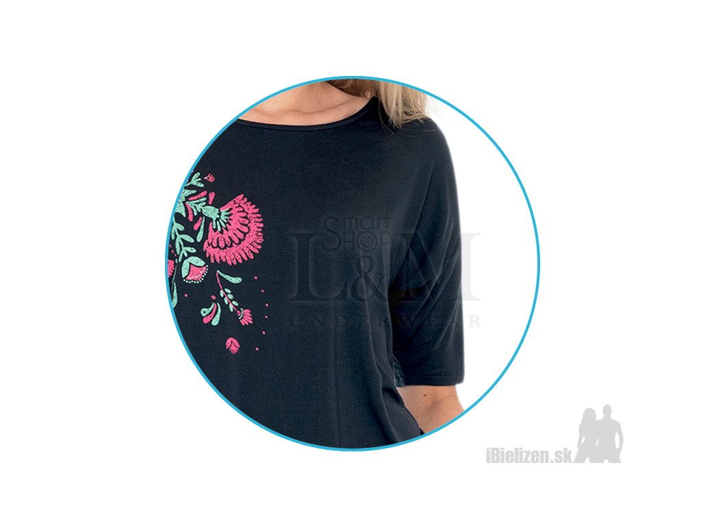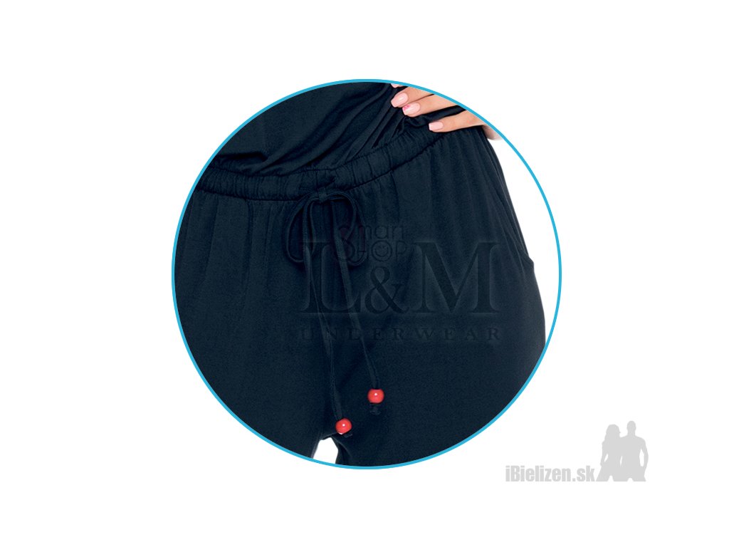 Dámske jednodielne pyžamo / domáci overal KEY LHJ546 je vyrobený z mäkkej a príjemnej viskózy s podielom elastanu typu Viscose-Silky-touch. Horná časť, tričko s veľkým dekoratívnym motívom na predom diely vpravo, má krátke rukávy a lodičkový výstrih. Zmyselný prestrih na chrbte má za krkom zapínanie na jeden gombík. Dolnú časť dámskeho overalu KEY LHJ546 tvoria ležérne dlhé nohavice so sťahujúcou šnúrou v páse, kde sa spája horná a dolná časť overalu. Nohavicová časť overalu má praktické vrecká po bokoch a sťahujúce gumičky v manžetách. Použitý materiál dámskeho overálu je mäkký a prijemný k telu, kvalitné spracovanie, skvelý strih a štýlová potlač spĺňajú požiadavky aj náročných zákazníčok.
