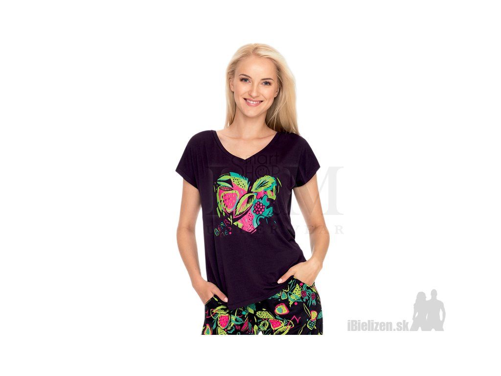 Dámske dvojdielne pyžamo / domáci úbor KEY LHS507 je vyrobený z mäkkej a príjemnej viskózy typu Viscose-Jersey&textile. Horný diel, tričko s veľkým dekoratívnym motívom - letné ovocie štýlovo naaranžované v tvare srdca, má krátke rukávy a okrúhly výstrih. Dolný diel dámskeho úboru KEY LHS507 tvoria štýlové dlhé ležérne nohavice s praktickými vreckami po bokoch a osviežujúcou potlačou letného ovocia. Použitý materiál dámskeho úboru je mäkký a prijemný na dotyk, kvalitné spracovanie, prepracovaný strih a štýlová potlač uspokoja požiadavky aj náročných zákazníčok.