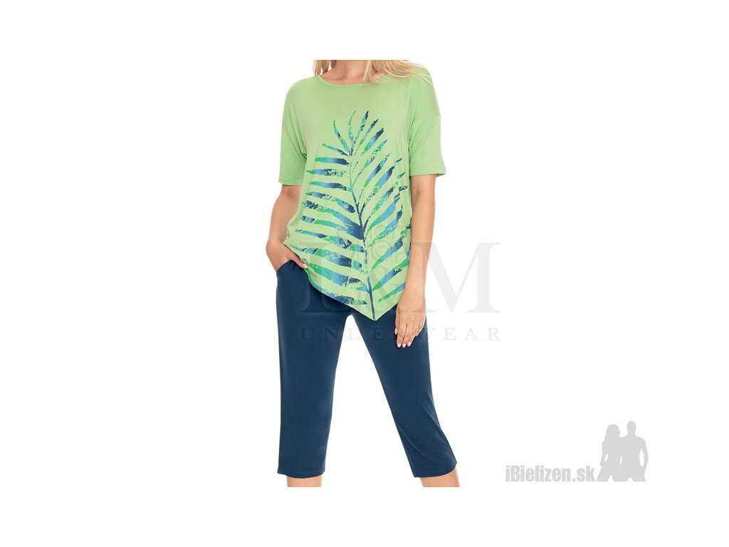 Dámske dvojdielne pyžamo / domáci úbor KEY LHS868 je vyrobený z mäkkej a príjemnej viskózy s podielom elastanu typu Viscose-Silky-touch. Horný diel, tričko s veľkým dekoratívnym motívom - potlačou papradia, má krátke rukávy, okrúhly výstrih a štýlové asymetrické, do špica, ukončenie spodného okraja vpredu aj vzadu. Dolný diel dámskeho úboru KEY LHS868 tvoria štýlové jednofarebné trojštvrťové ležérne nohavice s praktickými vreckami po bokoch. Použitý materiál dámskeho úboru je veľmi prijemný na dotyk, kvalitné spracovanie a prepracovaný strih uspokojí požiadavky aj náročných zákazníčok.