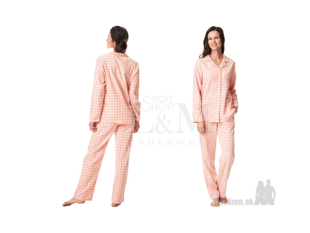 Dámske dvojdielne flanelové kárované pyžamo KEY LNS442 zhotovené zo 100%-nej bavlny Cotton Flannel 135 g/m2. Prírodná bavlnená, mäkká a hrejivá tkanina je priedušná a prijemná k telu a pohodlná na nosenie. Horný diel, flanelová pyžamová košeľa s dlhými rukávmi, V-výstrihom s golierom, vpredu so zapínaním na gombíky, na ľavom boku je malé vonkajšie vrecko. Rukávy a dolný okraj majú jednoduché lemovanie. Dolný diel dámskeho károvaného pyžama KEY LNS442 sú dlhé flanelové pyžamové nohavice, majú sťahujúcu gumu v páse, po bokoch praktické vrecká. Celé pyžamo má vodorovné karované vzorovanie. Je dostupné v atraktívnom ružovom prevedení. Použitý prírodný materiál je veľmi pohodlný a prijemný, kvalita dielenského spracovania, atraktívny strih a štýlové prevedenie spĺňajú aj tie najnáročnejšie požiadavky našich zákazníčok. Je veľmi pekné, stačí si ho pridať do nákupného košíky.