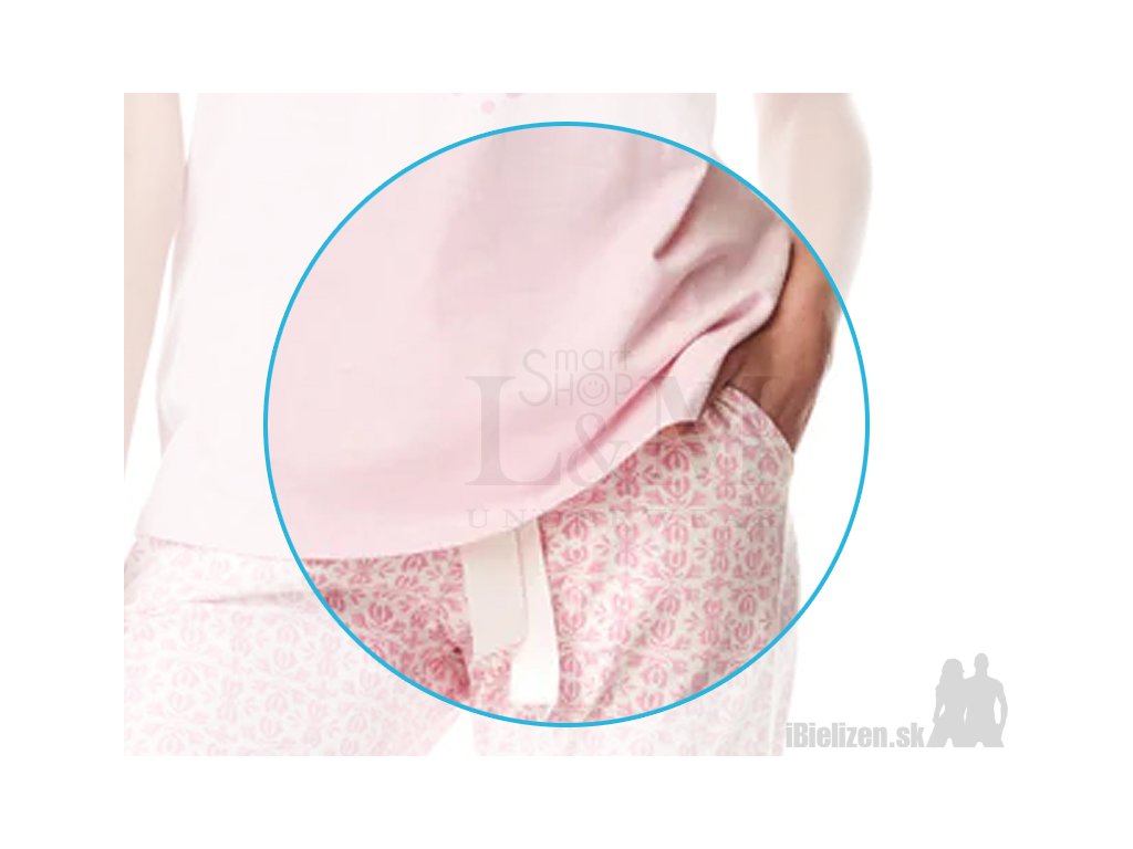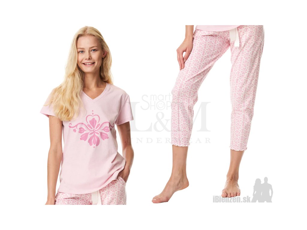 Dámske trojštvrťové vzorované pyžamo KEY LNS461 A23 z jemného bavlneného úpletu. Svetloružové tričko s veľkým kvetinovým motívom má krátke rukávy a V-výstrih. Trojštvrťové ležérne pyžamové nohavice s kvetinovou potlačou po celej dĺžke, majú sťahujúcu gumu a struhu v páse.