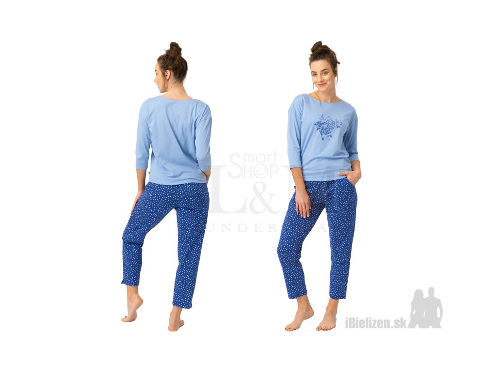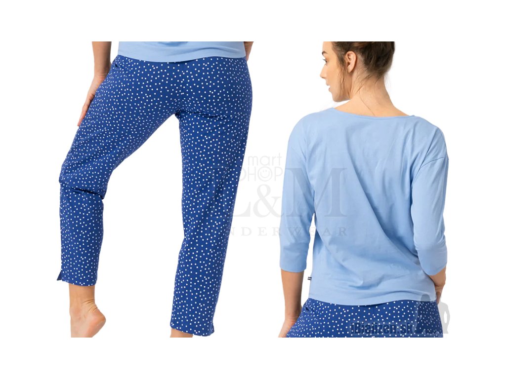 Dámske dvojdielne vzorované pyžamo KEY LNS550 A25 zhotovené zo bavlneného úpletu Cotton Pure 135 g/m2 s podielom bavlny 100%. Prírodná výnimočne mäkká rafinovaná bavlna so zníženou krčivosťou je antialergická a prijemná k telu. Pyžamové tričko s trojštvrťovými rukávmi, má okrúhly výstrih, vpredu s atraktívnym motívom, rukávy a dolný okraj majú jednoduché lemovanie. Bodkované pyžamové nohavice dámskeho pyžama KEY LNS550 A25 majú trojštvrťovú dĺžku, v páse prijemne sťahujúcu gumu, po bokoch praktické vrecká, légy majú jednoduché lemovanie. Je dostupné v atraktívnom modrom prevedení. Prírodný materiál je veľmi pohodlný, prispôsobivý a prijemný na nosenie, kvalita dielenského spracovania, atraktívny strih a štýlové prevedenie spĺňajú najnáročnejšie požiadavky našich zákazníčok. Tak si ho pridajte do nákupného košíka.