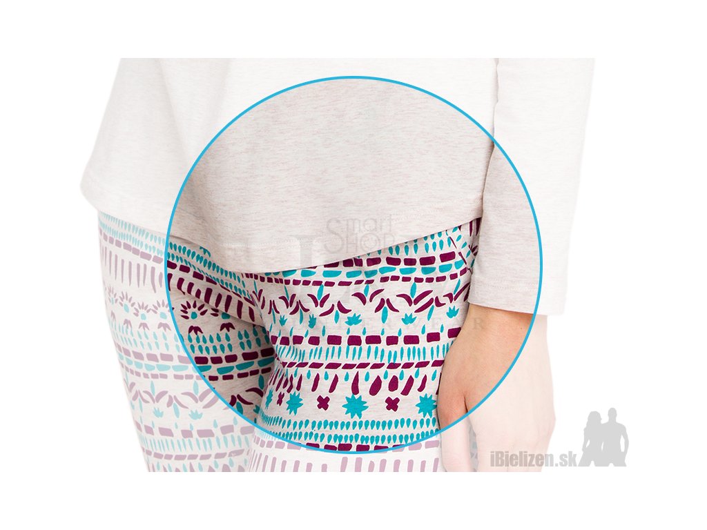 Dámske vzorované dvojdielne pyžamo KEY LNS702 je vyrobené z mäkkého a príjemného bavlneného úpletu s podielom elastanu. Horný diel, tričko s dlhými rukávmi má okrúhly výstrih pod ktorým je dekoratívny motív vo folklórnom štýle. Dolný diel dámskeho pyžama KEY LNS702 tvoria ležérne vzorované dlhé nohavice, majú úzky cigaretový strih, vzorovanie vo folklórnom štýle, praktické bočné vrecká a pohodlnú sťahujúcu gumu v páse. Dvojdielne dámske pyžamo je dostupné v smotanovom farebnom prevedení. Použitý prírodný materiál dámskeho pyžama je veľmi prijemný na dotyk, kvalitné spracovanie, prepracovaný strih a atraktívny folklórny motív ocenia aj náročné zákazníčky.