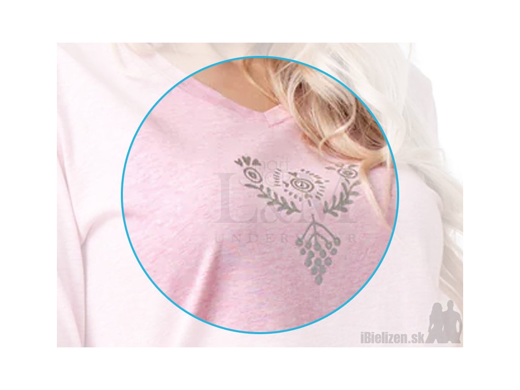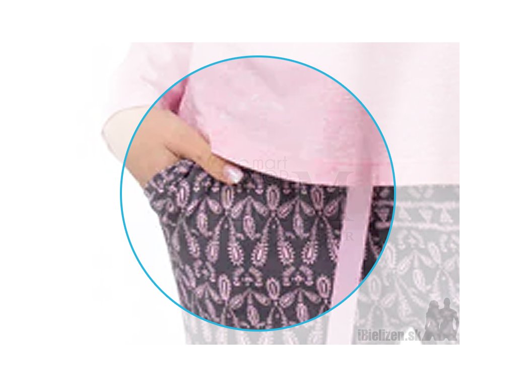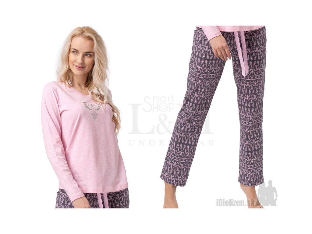 Dámske dvojdielne vzorované pyžamo KEY LNS794  zhotovené z bavlneného úpletu Cotton Soft 160 g/m2 s podielom bavlny až 95%. Prírodná bavlnená, mäkká a hrejivá tkanina je priedušná a prijemná k telu a pohodlná na nosenie. Horný diel, pyžamové tričko s dlhými rukávmi, V-výstrihom, s kvetinovým motívom na prsiach, má jednoduché lemovanie. Dolný diel dámskeho vzorovaného pyžama KEY LNS794  sú dlhé ležérne pyžamové nohavice s kvetinovým motívom po celej dĺžke, majú sťahujúcu gumu v páse, po bokoch sú praktické vrecká. Je dostupné v atraktívnom farebnom prevedení, ružové tričko so striebornou potlačou a tmavošedé nohavice s ružovou potlačou. Použitý prírodný materiál je veľmi pohodlný a prijemný, kvalita dielenského spracovania, atraktívny strih a štýlové prevedenie spĺňajú aj tie najnáročnejšie požiadavky našich zákazníčok. Neváhajte a pridajte si ho do nákupného košíka.