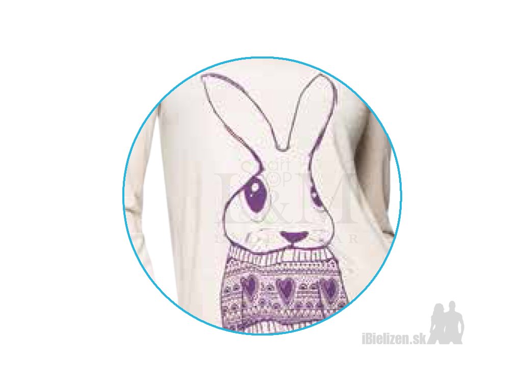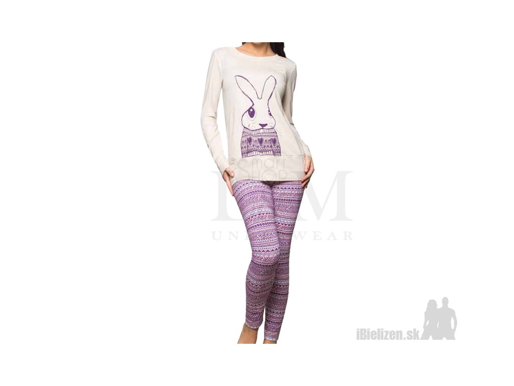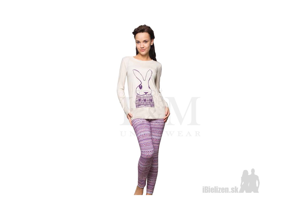 Dámske pyžamo KEY LNS796 je vyrobené z mäkkého a príjemného bavlneného úpletu typu soft-cotton v kombinácií s elastanom. Horný diel má dlhé rukávy so širokými lemami, má okrúhly výstrih a roztomilý motív zajačika na prednej strane, jeho spodná časť je taktiež ukončená širokým lemom. Dolný diel dámskeho pyžama KEY LNS796 tvoria vzorované legíny, ktoré spolu s horným dielom vytvárajú pohodlnú a efektnú súpravu. Použitý materiál dámskeho pyžama je veľmi prijemný na dotyk, pričom spolu s kvalitným spracovaním a prepracovaným strihom uspokojí požiadavky aj náročných zákazníčok.