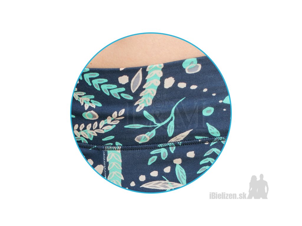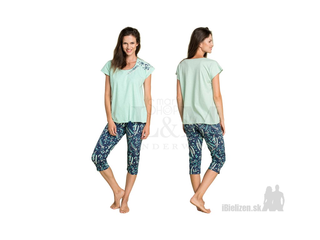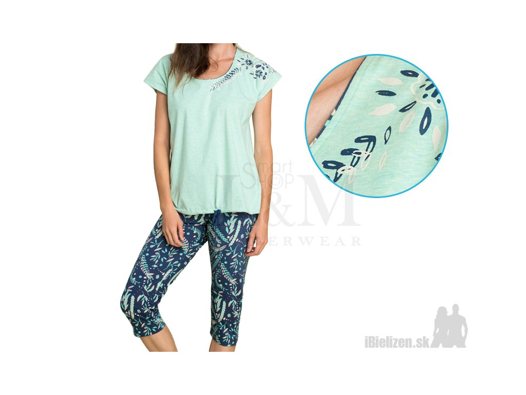 Dámske dvojdielne bavlnené pyžamo KEY LNS915 je vyrobené z prírodnej bavlny s podielom elastanu typu Cotton-Soft. Horný diel, svetlozelené tričko s krátkymi rukávmi, má okrúhly výstrih s tenkým farebným lemovaním, spodnú časť je možné stiahnuť šnúrkou. Na ľavom rukáve je väčší tlačený kvetinový motív zasahujúci až k prsiam. Dolný diel dámskeho pyžama KEY LNS915 tvoria ležérne trojštvrťové pyžamové nohavice so širokým elastickým pásom a malým rázporkom dole, sú potlačené rastlinným motívom na tmavomodrom podklade. Použitý materiál dámskeho pyžama je veľmi prijemný na dotyk, kvalitné spracovanie so skvelým strihom ocení každá z vás.