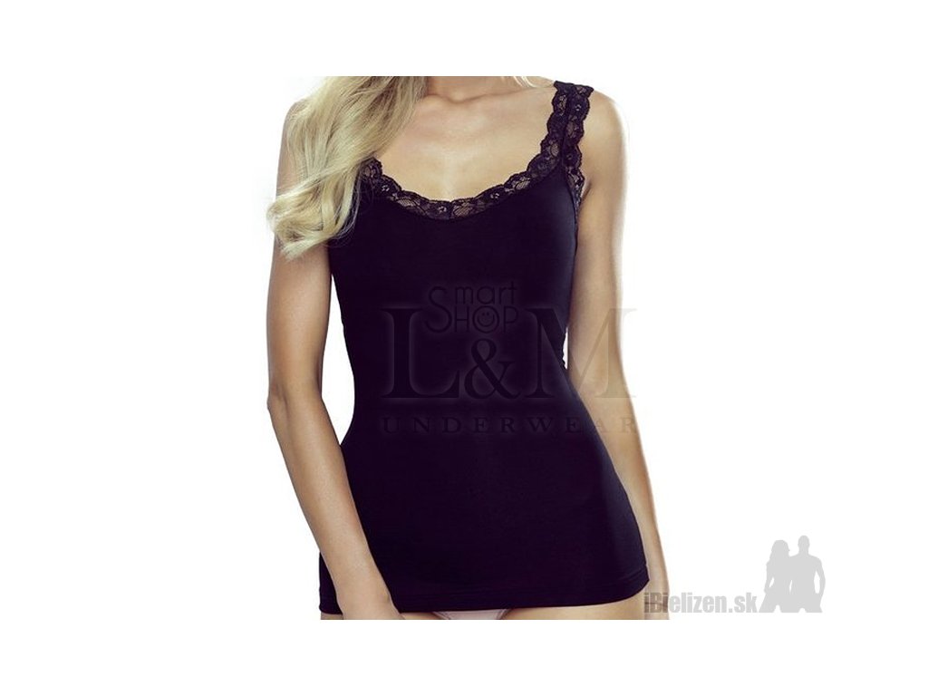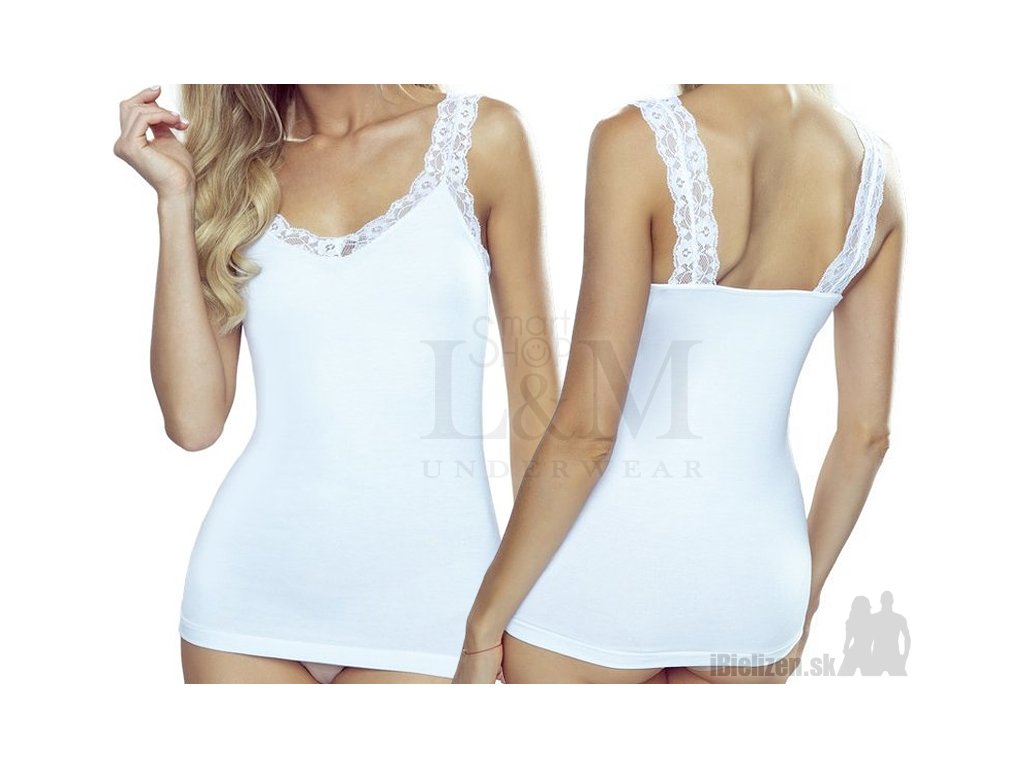 Dámske čipkované tielko Eldar Lori z modelovej rady Romantica so širokými ramienkami, hlbším okrúhlym výstrihom a vysokým podielom prírodnej viskózy. Tielko má hladký povrch, dekolt je lemovaný širšou čipkou, ktorá plynule prechádza do širokých krajkových ramienok končiacich na chrbte pod lopatkami. Dámske tielko Eldar Lori je prijemné k telu, vhodné na každú príležitosť, do štýlových outfitov aj na každodenné nosenie. Je dostupné v troch farebných prevedeniach - biele, modré a čierne. Vysoký podiel bavlny, atraktívny strih a štýlová krajka sú zárukou spokojnosti aj náročných dám.