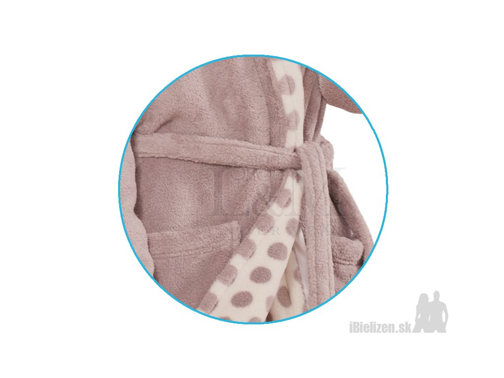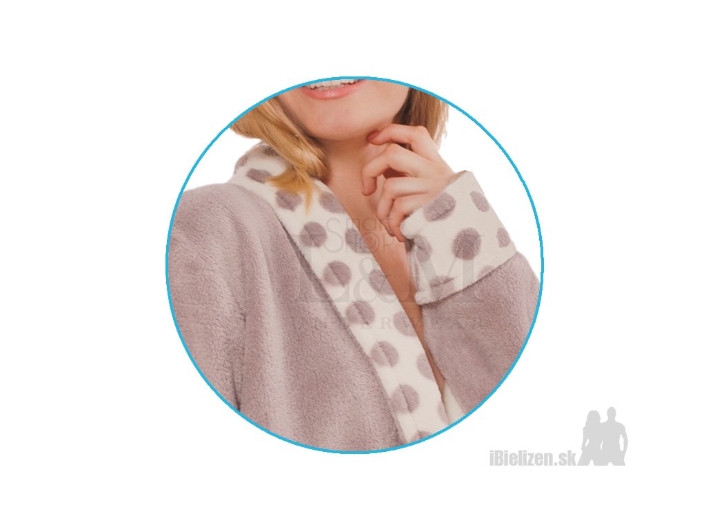Dlhý dámsky župan KEY LGL683 je vyrobený z mäkkého a príjemného úpletu typu soft vo farbe cappucino. V páse sa zaväzuje odnímateľným opaskom, po oboch stranách má veľké vrecká vo farbe základného materiálu, z ktorého je župan vyrobený. Šálový golier a manžety sú obšité lemom s roztomilými bodkami. Použitý materiál dámskeho županu KEY LGL683 je veľmi prijemný na dotyk, pričom spolu s kvalitným spracovaním uspokojí požiadavky aj náročných zákazníčok.