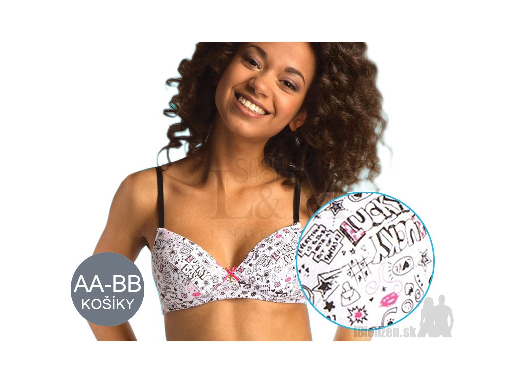Dievčenská bavlnená podprsenka Key TBC890 má hladké tenko vystužené penové košíky zošité z dvoch dielov. Podprsenka je vzorovaná atraktívnym teenage motívom po celej ploche. Košíky bez kostíc sú spojené hrubším stredným dielom na ktorom je malá dekoratívna mašlička so štýlovým kovovým kľúčikom. Podprsenka Key TBC890 pre násťročné slečny má štandardné tenšie neodopínateľné dĺžkovo nastaviteľne ramienka. Podprsenka má dĺžkovo nastaviteľný obvod s jednoradovým zapínaním na tri pozície. Je kvalitne spracovaná a je skvelou voľbou v bielizníku každej slečny. Prijemný materiál až 95% bavlna s podielom elastanu.
