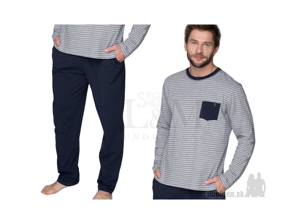 Pánske dvojdielne vzorované pyžamo KEY MNS030 je vyrobené z mäkkého a príjemného 100%-ného bavlneného úpletu typu Cotton-Pure. Horný diel tvorí pásikované tričko s okrúhlym výstrihom a dlhými rukávmi, na hrudi vľavo je praktické vrecko. Vodorovné tenké pásiky v tmavo-modrej farbe sú na svetlom šedom melanžovanom podklade. Dolný diel pánskeho pyžama KEY MNS030 tvoria pohodlné jednofarebné pyžamové nohavice, s pohodlnou sťahujúcou gumou v páse, po bokoch sú praktické vrecká. Dlhé nohavice a tričko s dlhými rukávmi spolu tvoria pohodlnú pánsku pyžamovú súpravu. Použitý 100%-ne prírodný materiál pánskeho pyžama je pohodlný a prijemný k telu, kvalita spracovania a prepracovaný strih oslovia každého náročného zákazníka.