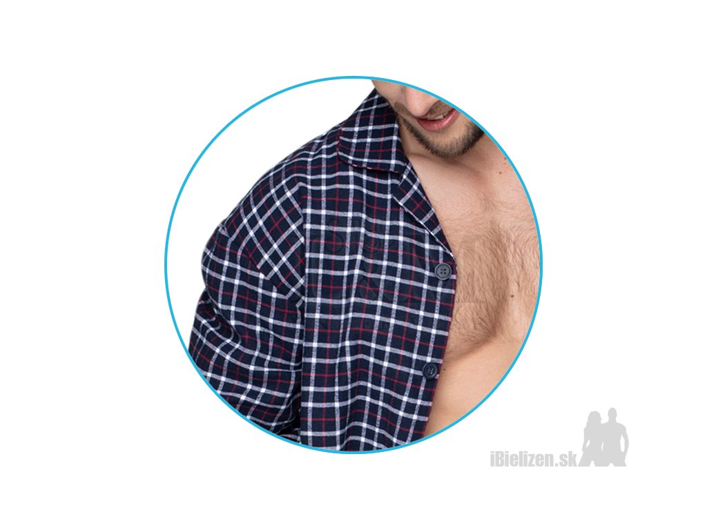 Pánske dvojdielne karované pyžamo KEY MNS046 je vyrobené z mäkkého a príjemného 100%-ného bavlneného flanelového úpletu typu Flannel-Cotton. Horný diel tvorí karovaná pyžamová košeľa s golierom v modrom prevedení, má zapínanie na gombíky, má dlhé rukávy a vrecko na prsiach vľavo. Dolný diel pánskeho pyžama KEY MNS046 tvoria ležérne karované pyžamové nohavice taktiež v modrom prevedení, majú zapínanie gombík a sťahujúcu gumu v páse, po bokoch sú praktické vrecká. Dlhé nohavice a štýlová košeľa s dlhými rukávmi tvoria pohodlnú pánsku pyžamovú súpravu. Použitý 100%-ne prírodný materiál je pohodlný a prijemný k telu, kvalita spracovania, prepracovaný strih a atraktívne karované prevedenie oslovia každého náročného zákazníka.