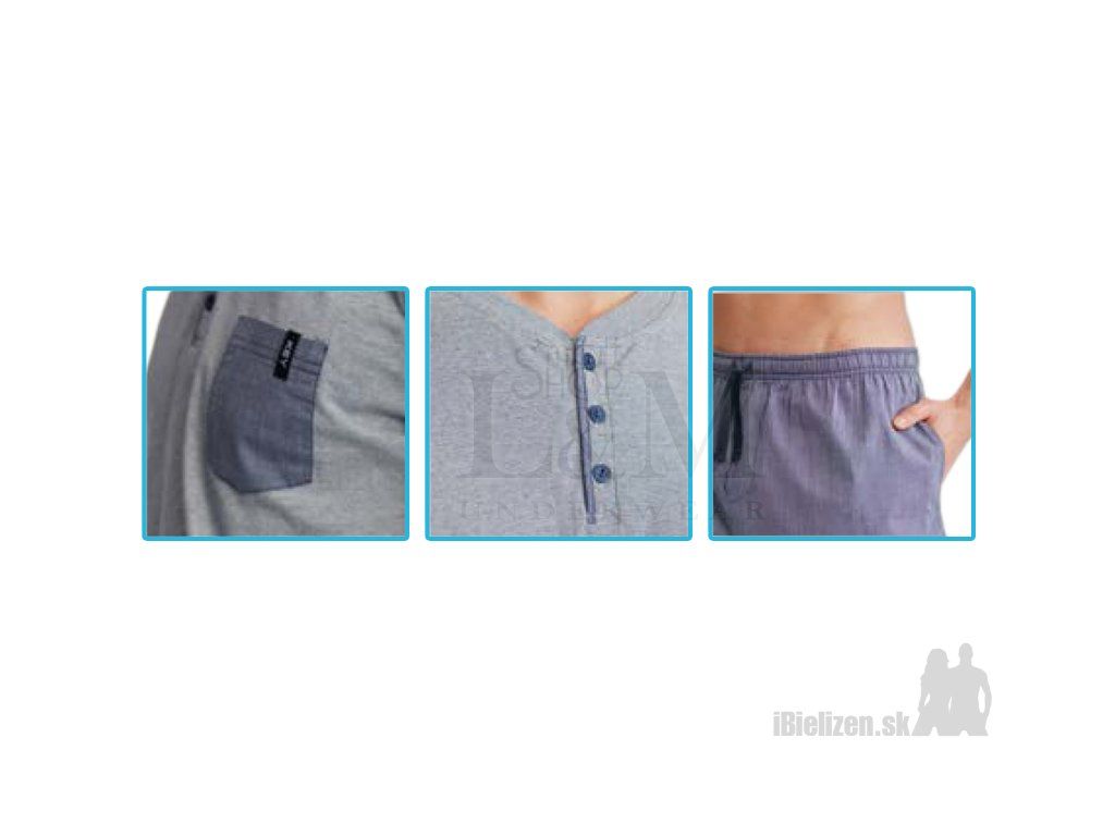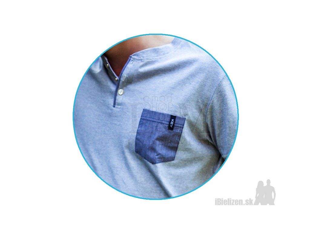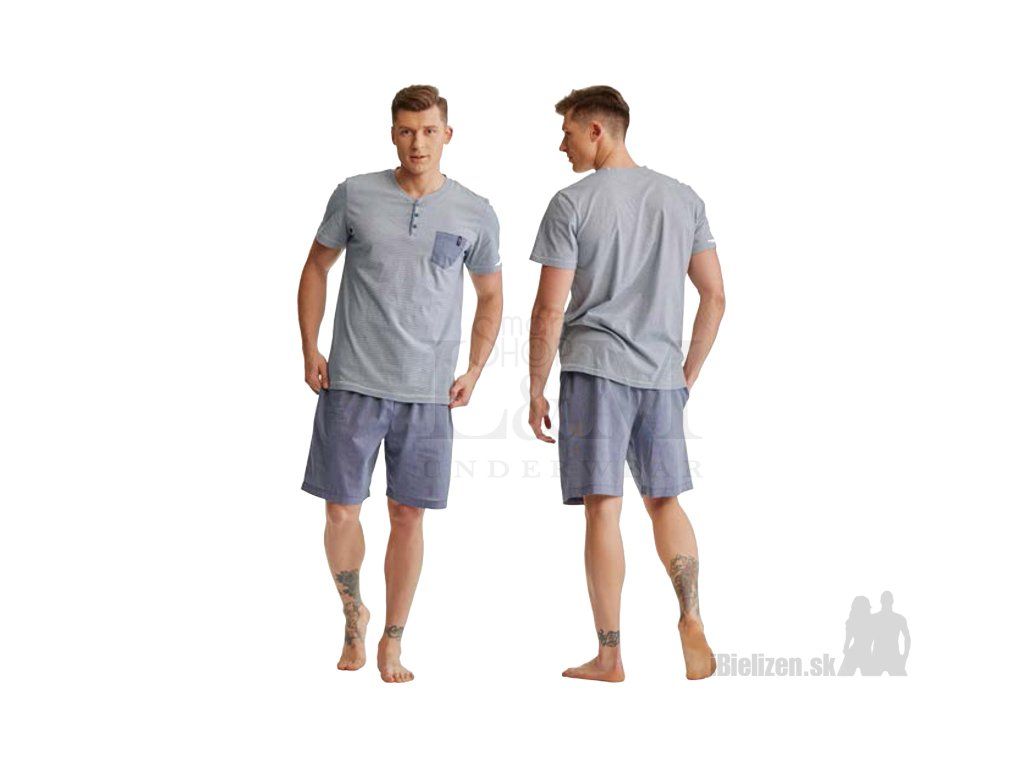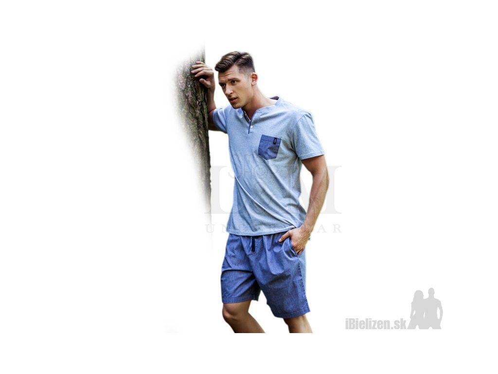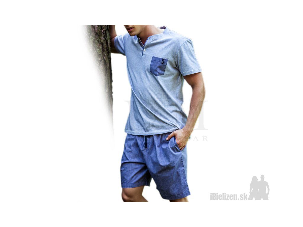 Pánske pyžamo KEY MNS367 je vyrobené z mäkkého a príjemného bavlneného úpletu typu cotton-pure. Horný diel je jednofarebné tričko typu polokošele s praktickým vreckom, má krátke rukávy. Dolný diel pánskeho pyžama KEY MNS367 tvoria ležérne jednofarebné pyžamové šortky so sťahujúcou gumou a šnúrkou v páse, po bokoch majú praktické vrecká. Spolu s horným dielom vytvárajú pohodlnú pyžamovú súpravu. Použitý materiál pánskeho pyžama je veľmi prijemný na dotyk, pričom spolu s kvalitným spracovaním a prepracovaným strihom uspokojí požiadavky aj náročného zákazníka.
