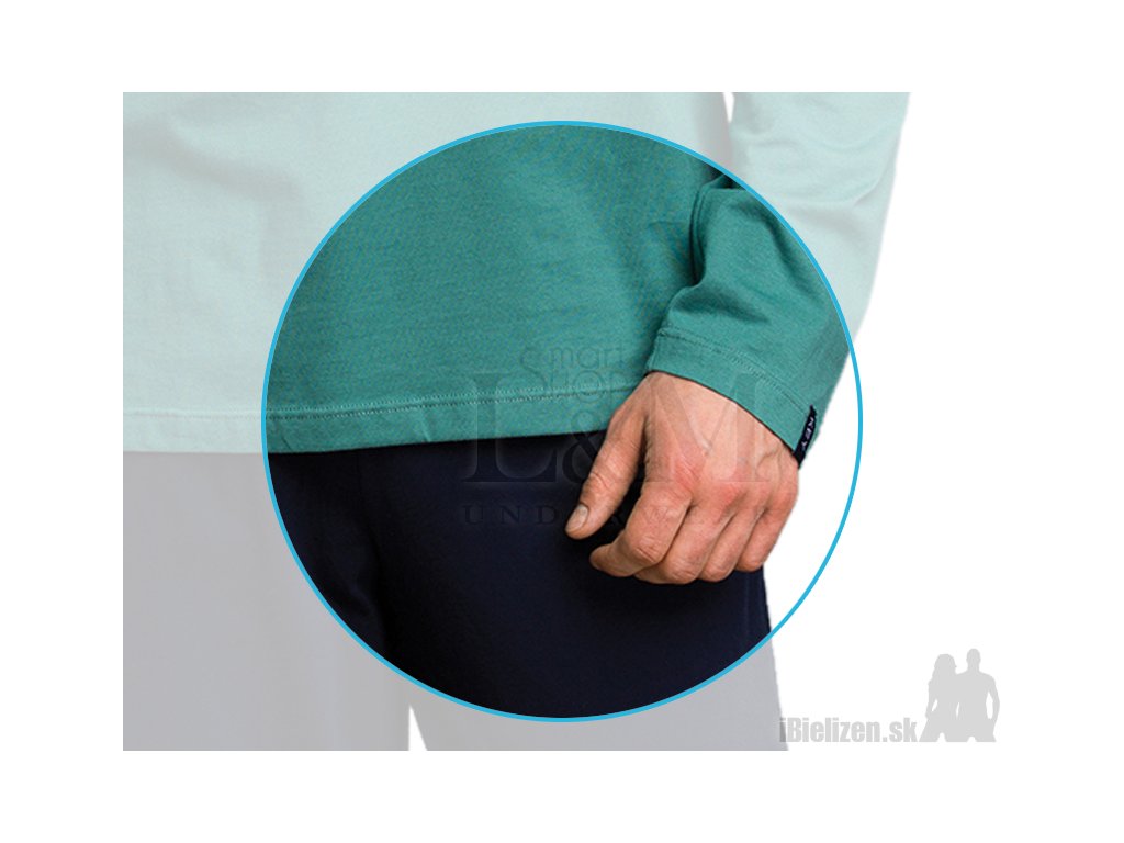Pánske dvojdielne bavlnené pyžamo KEY MNS785 je vyrobené z mäkkého a príjemného 100%-ného bavlneného úpletu. Horný diel tvorí zelené tričko s okrúhlym výstrihom, má dlhé rukávy a dominantný naturálny motív - stromy. Dolný diel pánskeho pyžama KEY MNS785 tvoria pohodlné dlhé tmavomodré pyžamové nohavice, majú komfortnú gumu v páse so sťahovaním na šnúru. Nohavice majú praktické vrecká na bokoch. Štýlová pánska pyžamová súprava na celoročné použitie. 100%-ne prírodná bavlna sa prijemne nosí a jednoducho udržiava, štýlový motív, kvalitné spracovanie si získajú priazeň každého náročného zákazníka.